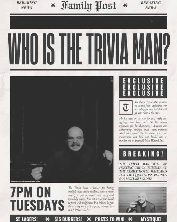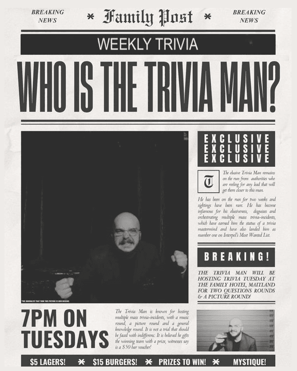 🍻$5 Beers!🍔$15 Burgers!🎉$50 Bistro and Bar voucher for the winner!❔THREE ROUNDS TOTAL: 🎵1 Music Round🖼️ 1 Picture Round and 🧐 1 General Knowledge Round!
